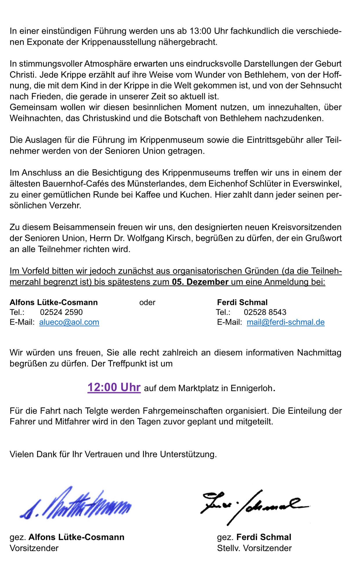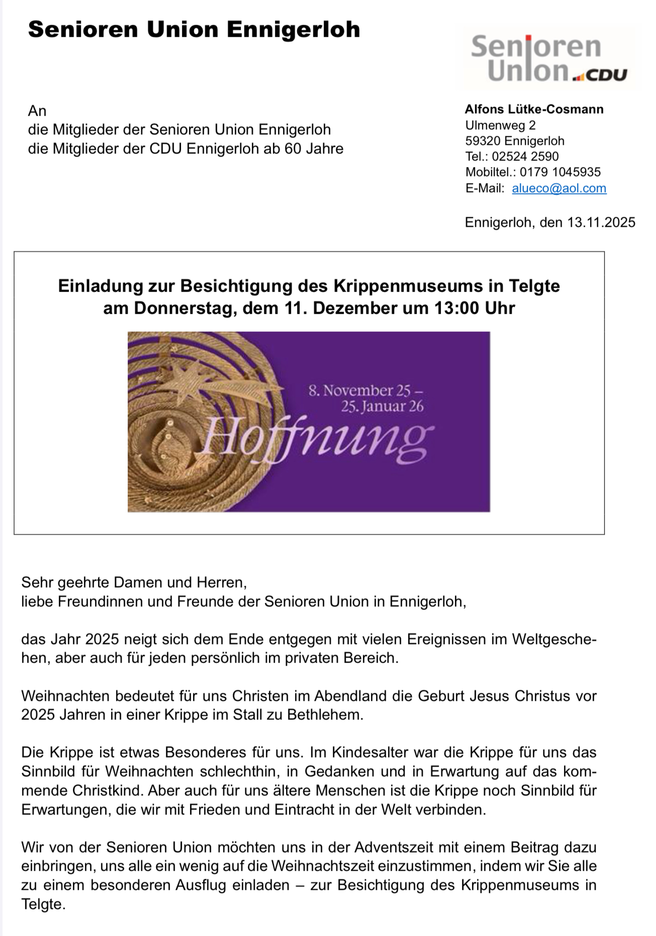 11.12.2025 Besichtigung Krippenmuseum in Telgte, inklusive Ausklang in gemütlicher Runde, bei Kaffee und Kuchen im Eichenhof Schlüter/Everswinkel