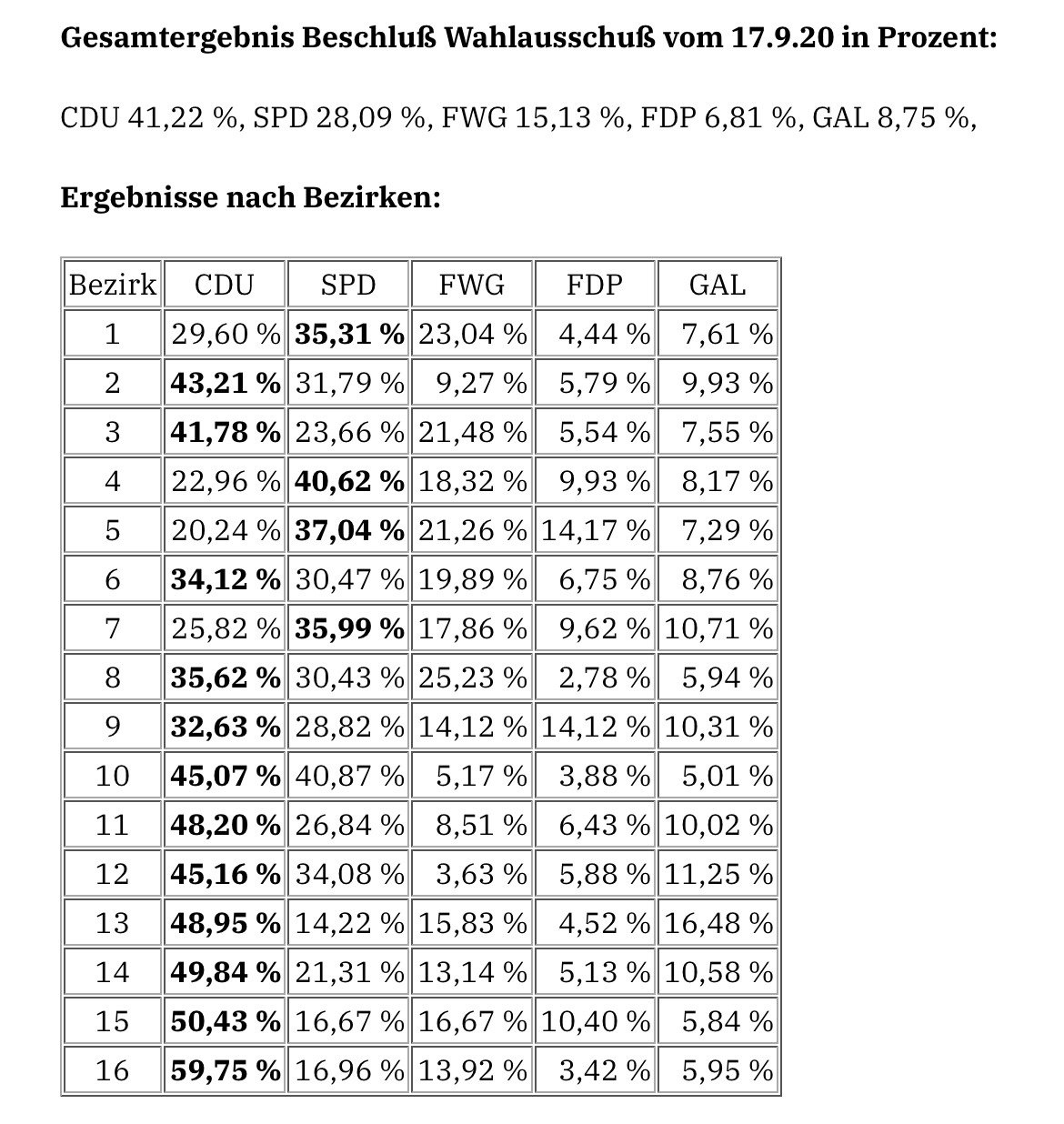 Bezirk | CDU | SPD | FWG | Linke | Die Partei |