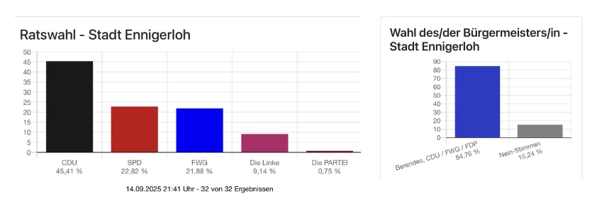 CDU 45,41%, SPD 22,82%, FWG 21,88%, Linke 9,14%, Die Partei 0.75%